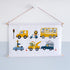 Textielposter voor kinderkamer met verschillende dieren onderweg in verschillende voertuigen. In de bijzondere maat van 60cm breed en 40cm hoog. Leuk voor babykamer en jongenskamer.