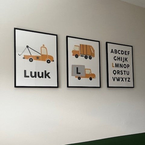 Super stoere posterset met naam van 3 posters met daarop een takelwagen, een containerauto en een vrachtwagen!